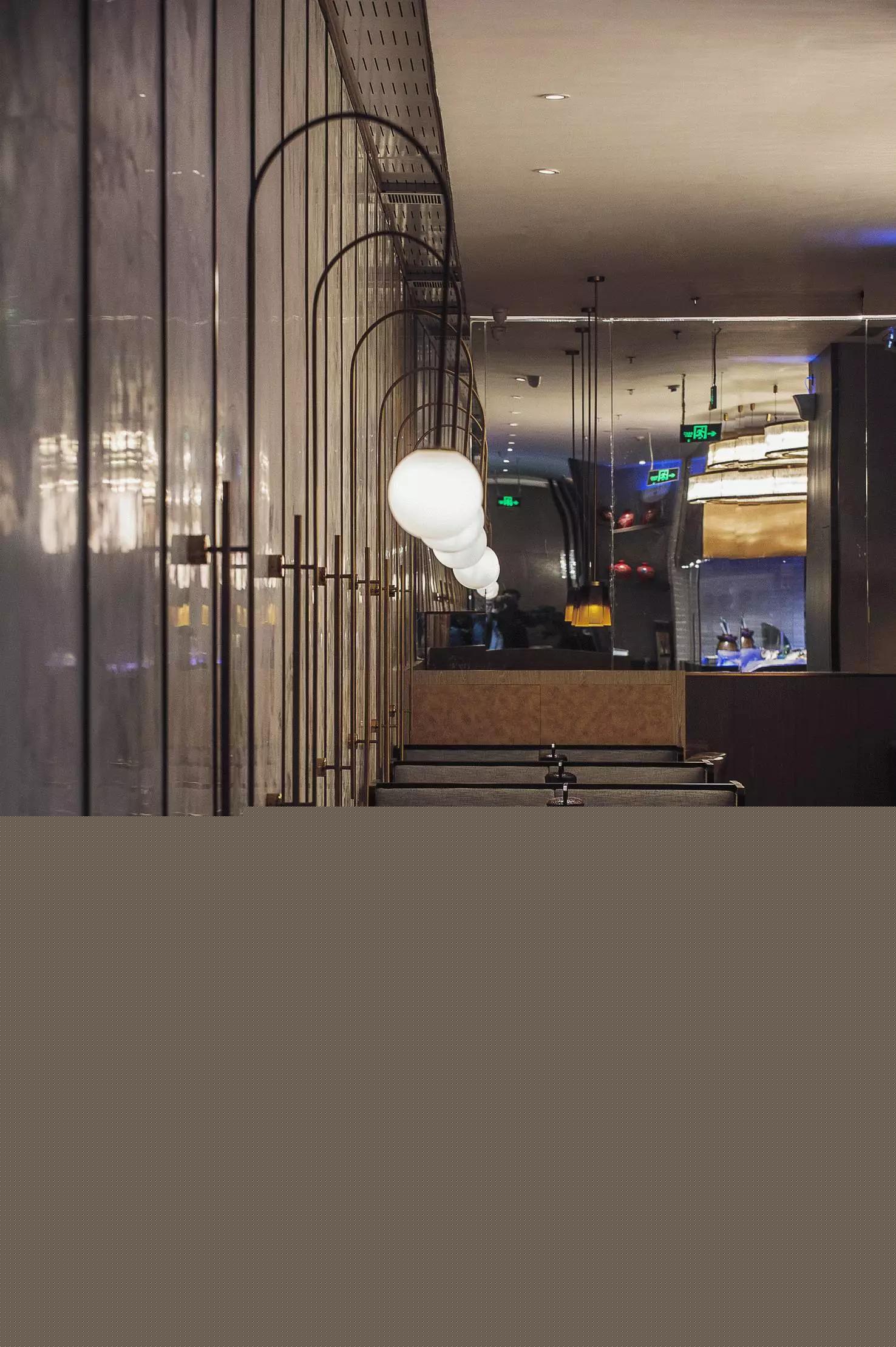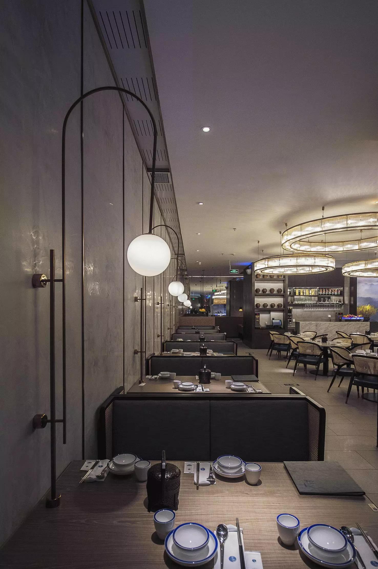 用餐區(qū)完全是一個開放的空間,沒有很多的隔斷,圓桌和方桌有序排布,既充分利用了空間又避免了單調,結合燈具的設計,就像在老家庭院里的大家庭聚餐——夜晚,歸來的親人們,在清涼的月色中,你來我往,和和樂樂,傳遞此間。