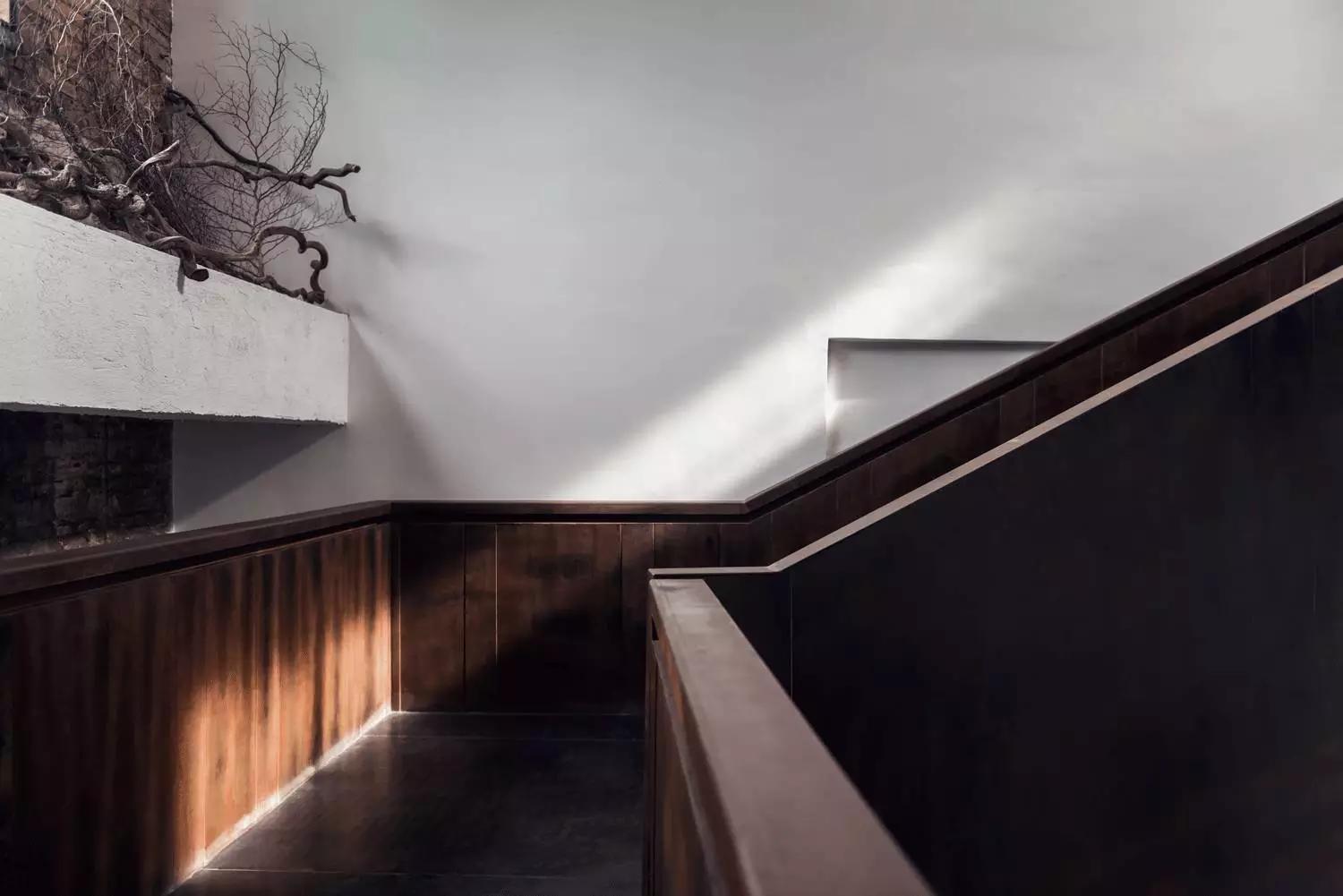 首層接待區(qū)是一個簡潔現(xiàn)代的空間,用以緩衝道路上的喧囂。訪客可以稍事停留,也可以順著樓梯自然而然的向上行走。